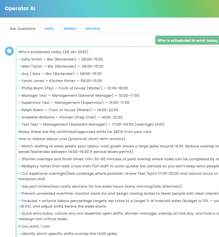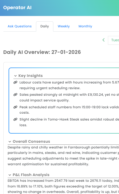 Troncbox remains the system of record for allocations and compliance. Opsyte connects staff, hous, sales, HR, local information and site information and generates a daily AI summary so you can spot issues fast, explain the “why”, and take action.